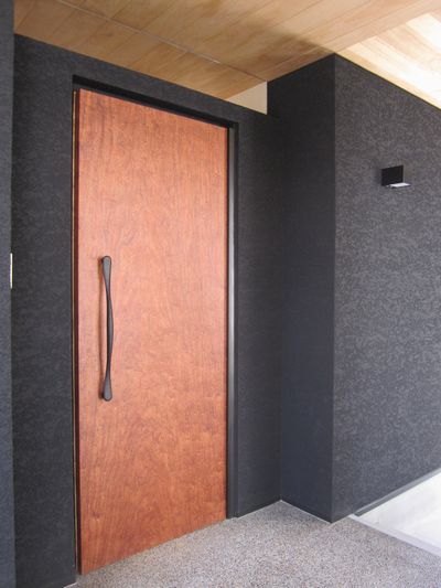 板が綺麗すぎてわかりづらいですが、無垢の一枚板の玄関ドアです。