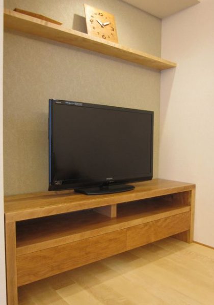 下のテレビボードは巾木をよけてぴったりサイズで作ってあります。