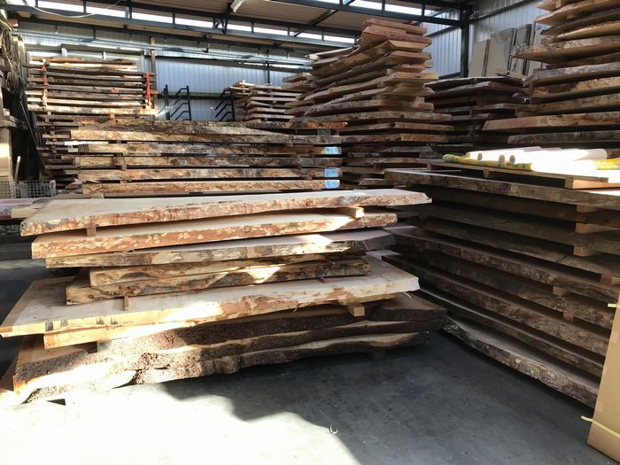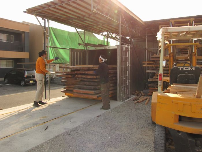ここでしばらく乾燥させます。ここに横積みしてある板は、乾燥前のもので、