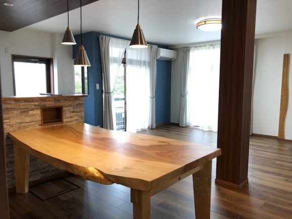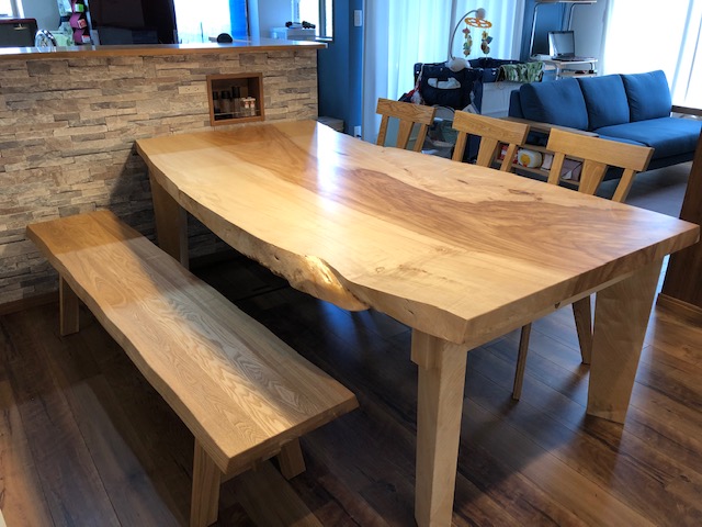 栃一枚板のダイニングテーブル、脚も同じ栃材で作ってあります。